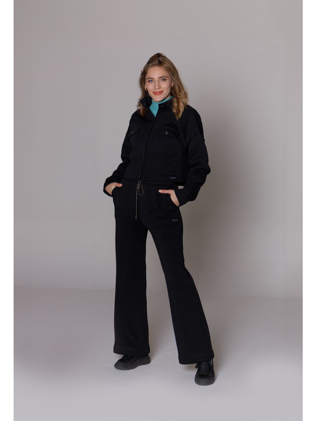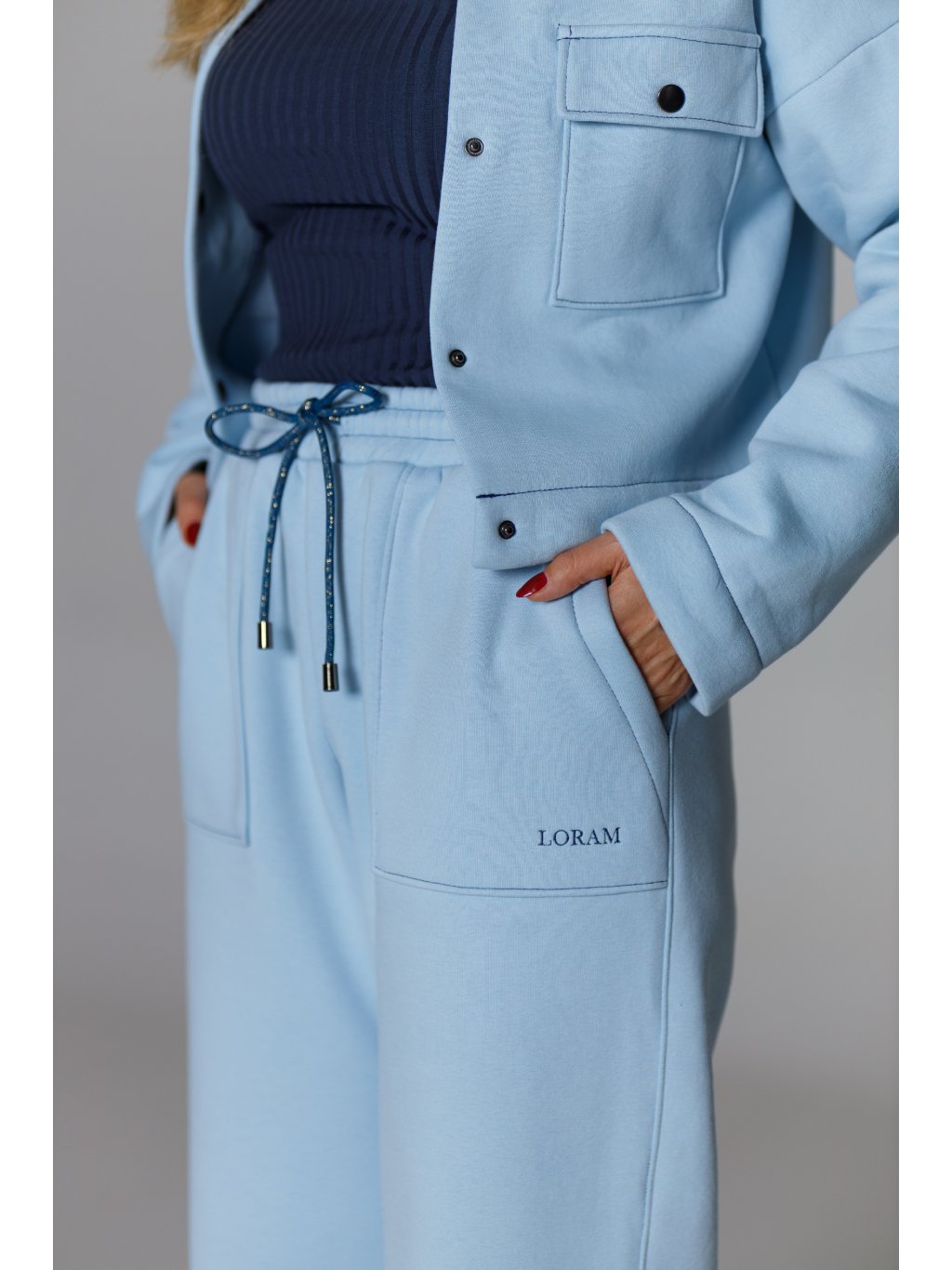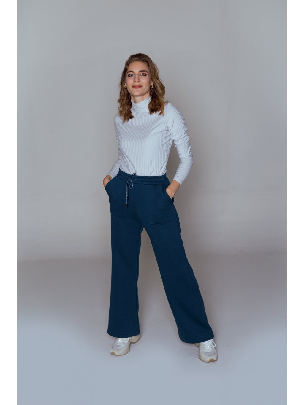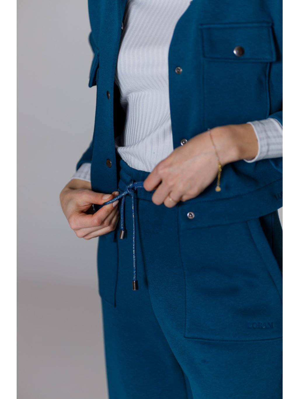 - Tepláky mají designově tvarované kapsy a stahování na designovou šňůrku s kovovými koncovkami.