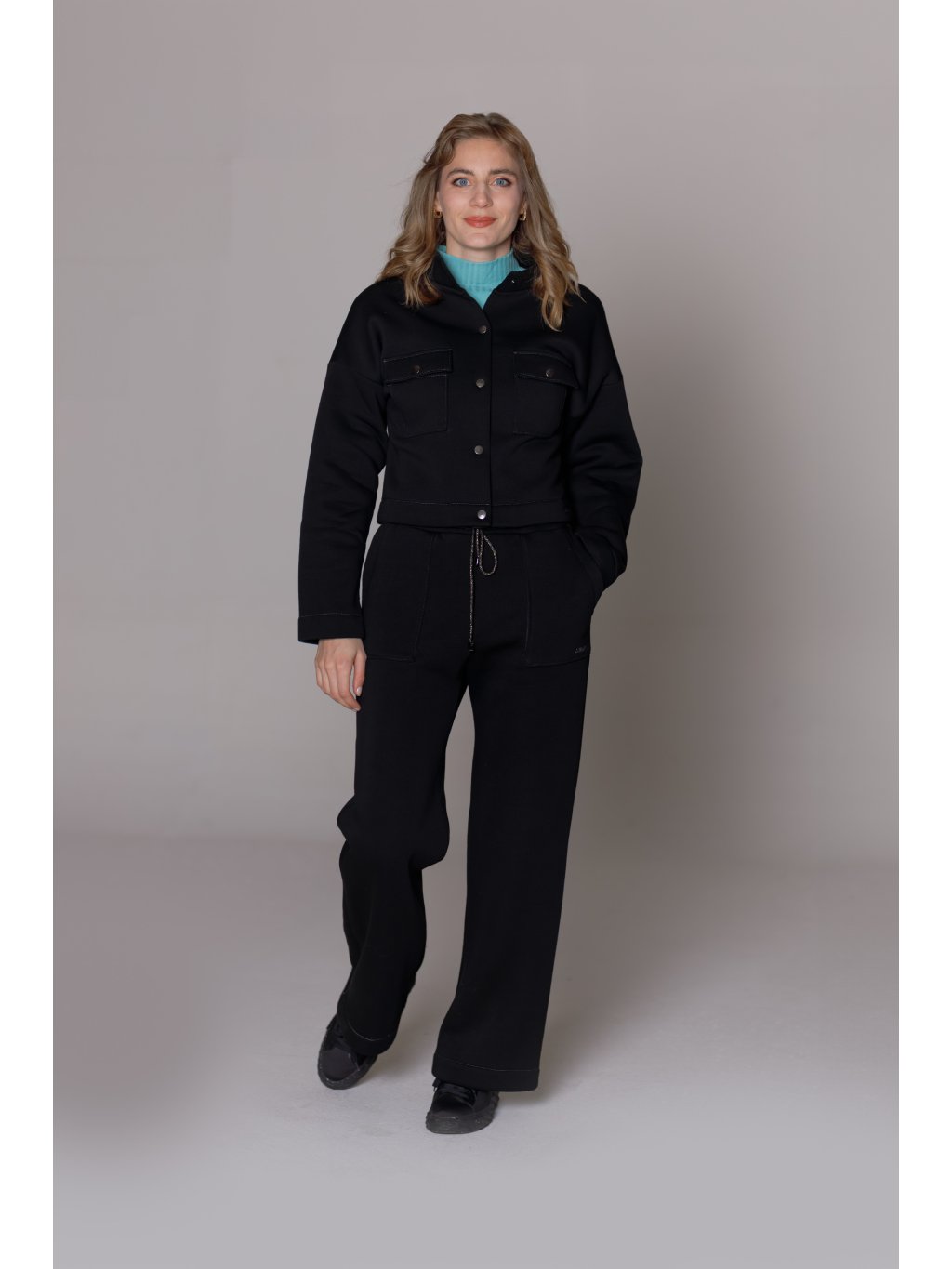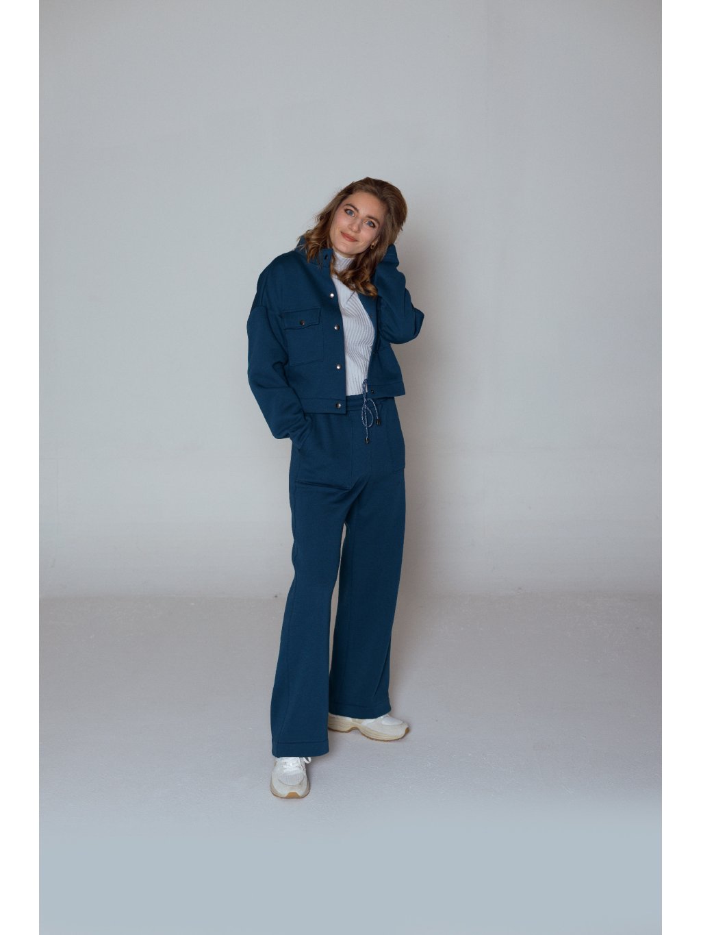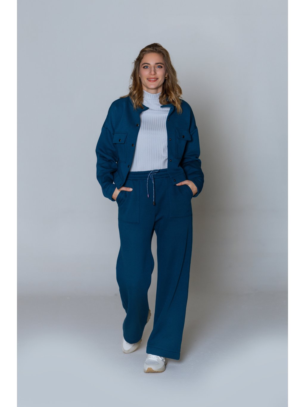- Tepláky mají designově tvarované kapsy a stahování na designovou šňůrku s kovovými koncovkami.