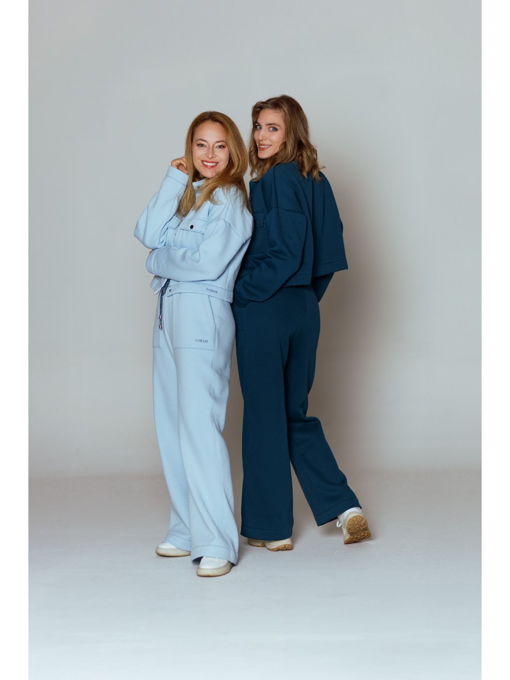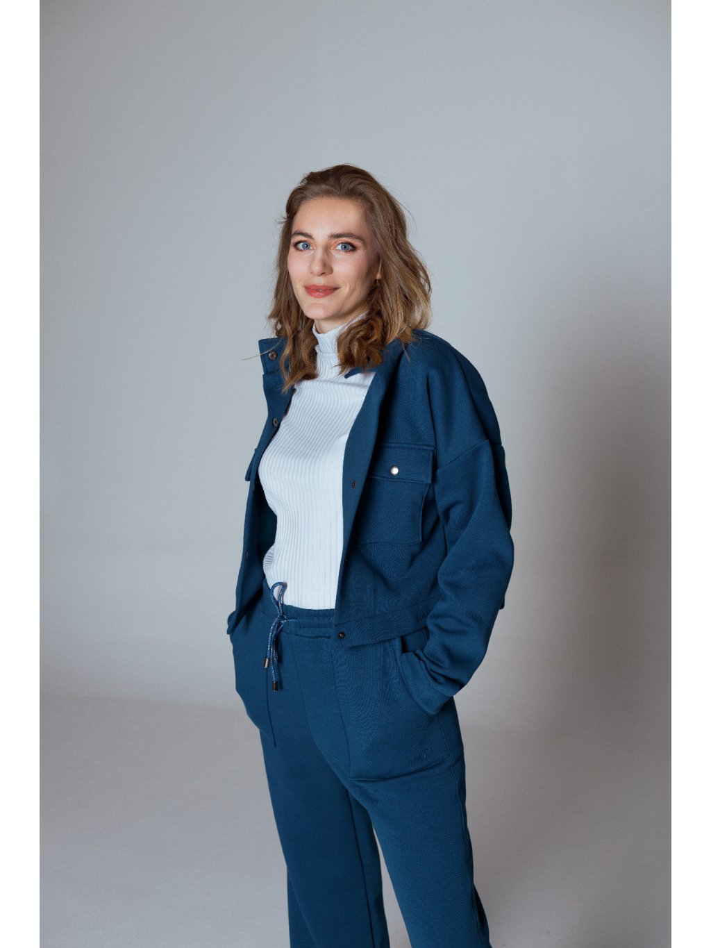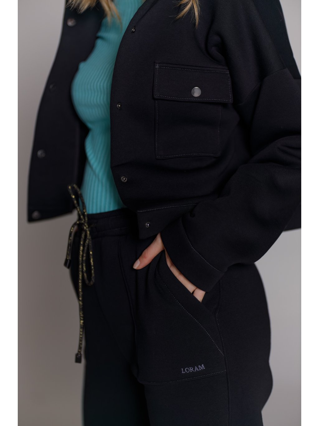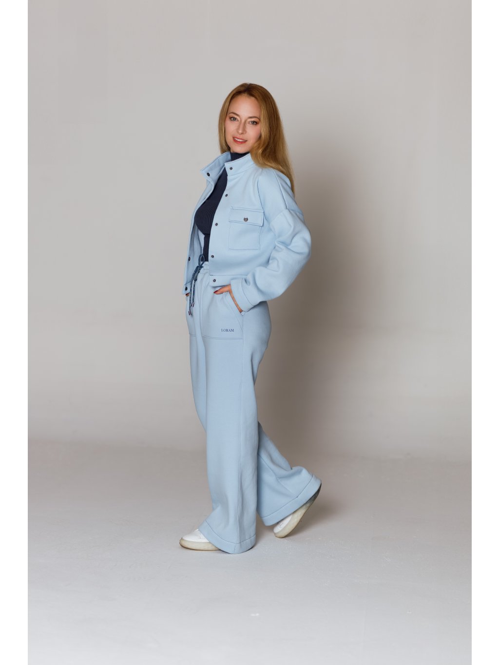 - Tepláky mají designově tvarované kapsy a stahování na designovou šňůrku s kovovými koncovkami.
